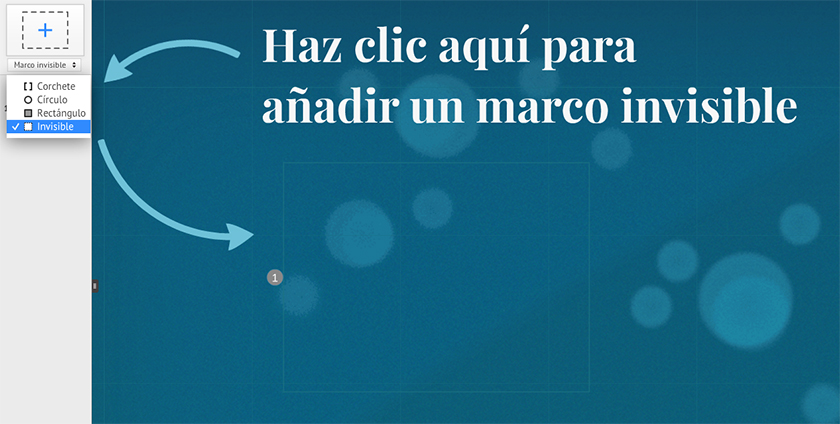 La opción de ocultar los marcos te ayuda a organizar el contenido prescindiendo de la carga visual que estos suponen. Esta opción es ideal para resaltar detalles en una imagen grande o bloque de texto, y muy útil si quieres presentar tu prezi sin una ruta predefinida.Para agregar un marco invisible al prezi, selecciona Invisible en el menú desplegable, ubicado en el lateral izquierdo de la pantalla, y arrástralo hasta el lienzo.