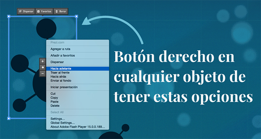 La posibilidad de traer objetos hacia delante o llevarlos hacia atrás te permite disponer en capas los distintos elementos que forman tu prezi. Es especialmente útil cuando tienes un marco que encuadra varios elementos o una imagen de fondo que se solapa con otros objetos del prezi. Si deseas traer objetos hacia adelante o llevarlos hacia atrás, haz clic una vez sobre el objeto que quieres mover para que se muestre la Herramienta de Transformación y, a continuación, haz clic sobre ella con el botón secundario para tener acceso a más opciones de edición.